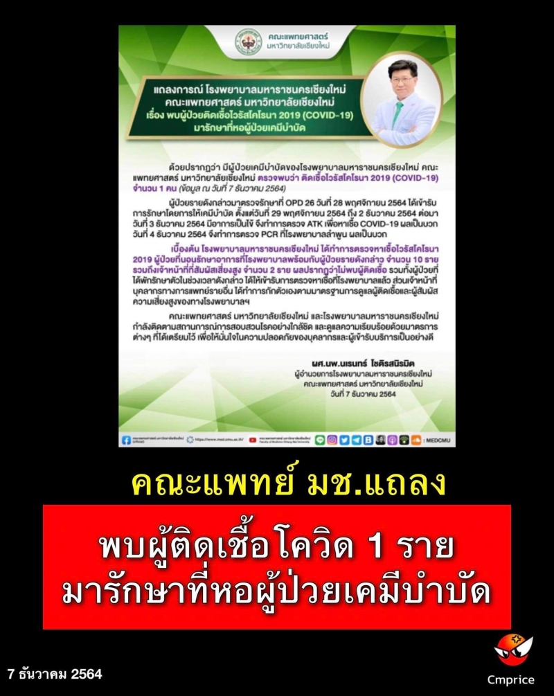 | • คณะแพทย์ มช. แถลง พบผู้ติดเชื้อโควิด รักษาที่หอผู้ป่วยเคมีบำบัด |