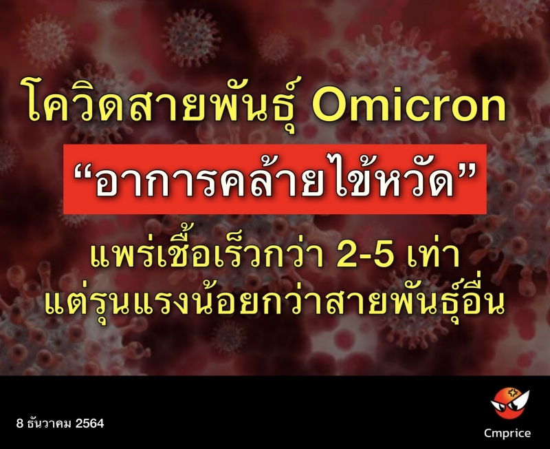| • โควิดสายพันธุ์ Omicron อาการคล้ายไข้หวัด แพร่เชื้อเร็วกว่า 2-5 เท่า แต่ความรุนแรงน้อยกว่าสายพันธุ์อื่น |