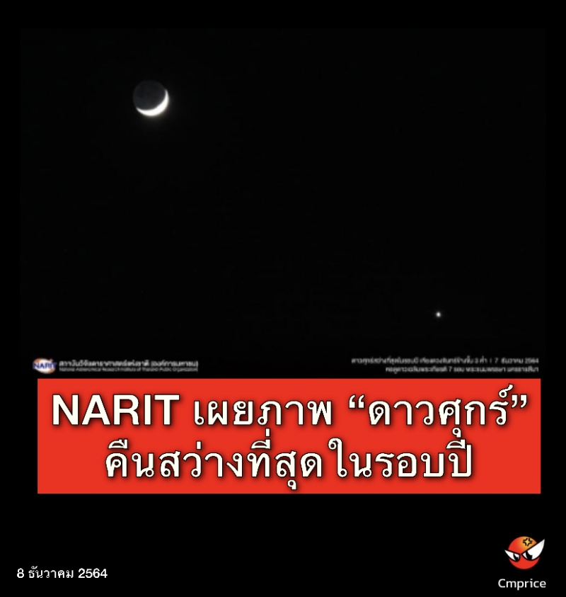 ภาพ “ดาวศุกร์” ในคืนสว่างที่สุดในรอบปี ค่ำวันที่ 7 ธันวาคม 2564 ปรากฏสว่างสุกใสทางทิศตะวันตก เคียงดวงจันทร์เสี้ยวบาง เห็นเด่นชัดในทุกภูมิภาคของไทย ให้คนไทยได้ชมความสว่างสุกใสของดาวศุกร์ในค่ำคืนนี้ท่ามกลางทัศนวิสัยท้องฟ้าใส ไร้เมฆ และสภาพอากาศที่เย็นสบาย ยกเว้นภาคใต้ที่อยู่ในช่วงมรสุม ดาวศุกร์สว่างที่สุดเป็นช่วงที่ดาวศุกร์โคจรห่างจากโลกในระยะทางที่เหมาะสม และมีขนาดเสี้ยวค่อนข้างใหญ่ สำหรับในช่วงอื่นแม้ดาวศุกร์จะมีเสี้ยวที่หนากว่า แต่ด้วยตำแหน่งอยู่ห่างจากโลกมาก ความสว่างจึงลดลงตามไปด้วย หลังจากวันนี้ ความสว่างของดาวศุกร์จะลดลงเล็กน้อย และจะกลับมาสว่างที่สุดอีกครั้งหนึ่งในวันที่ 9 กุมภาพันธ์ 2565 ทางทิศตะวันออกก่อนดวงอาทิตย์ขึ้นในตอนเช้า