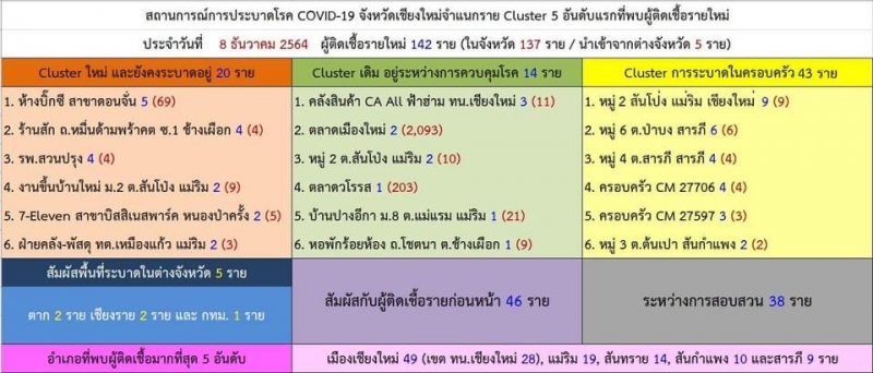 วันนี้ (8 ธ.ค. 64) ดร.ทรงยศ คำชัย หัวหน้ากลุ่มงานควบคุมโรคติดต่อ สำนักงานสาธารณสุขจังหวัดเชียงใหม่ เปิดเผยถึงสถานการณ์การแพร่ระบาดของโรคโควิด-19 จังหวัดเชียงใหม่ ประจำวันว่า มีผู้ติดเชื้อรายใหม่จำนวน 142 รายเป็นผู้ติดเชื้อที่เดินทางมาจากต่างจังหวัดเพียง 5 ราย ที่เหลือเป็นผู้ติดเชื้อในจังหวัด โดยมาจากคลัสเตอร์ใหม่ และคลัสเตอร์ที่ยังมีการระบาดอย่างต่อเนื่อง 20 ราย จาก 7 คลัสเตอร์เป็นคลัสเตอร์เดิม ที่ยังมีการระบาดต่อเนื่อง 3 แห่งและคลัสเตอร์ใหม่อีก 3 แห่ง ได้แก่ คลัสเตอร์ห้างบิ๊กซี สาขาดอนจั่น 5 ราย ,คลัสเตอร์ใหม่ ร้านสัก ถนนหมื่นด้ามพร้าคต ซอย 1 ตำบลช้างเผือก 4 ราย ,คลัสเตอร์โรงพยาบาลสวนปรุง 4 ราย ซึ่งมีความเชื่อมโยงกับคลัสเตอร์งานประชุมที่ร้าน Fuel Coffee และคลัสเตอร์บิ๊กซีเชียงใหม่ สาขาดอนจั่น ,คลัสเตอร์งานขึ้นบ้านใหม่ หมู่ 2 ตำบลสันโป่ง อำเภอแม่ริม 2 ราย ,คลัสเตอร์ใหม่ 7-Eleven สาขาเชียงใหม่บิสสิเนสพาร์ค 2 ราย และคลัสเตอร์ใหม่ ฝ่ายคลัง-พัสดุเทศบาลตำบลเหมืองแก้ว อำเภอแม่ริม 2 ราย