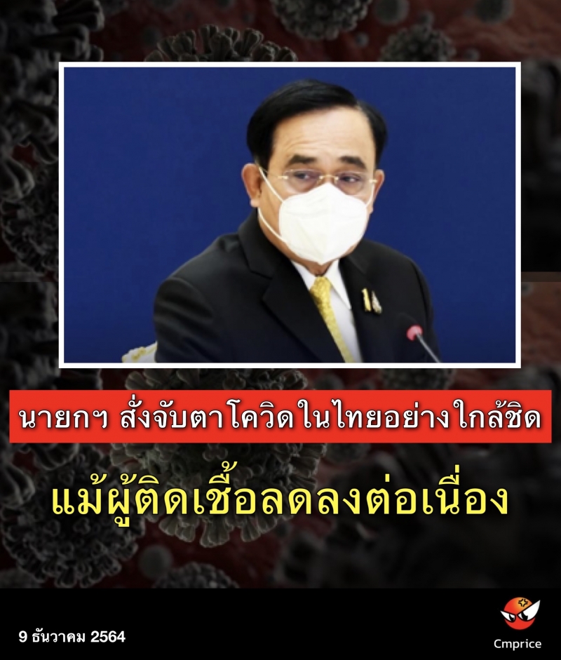 วันที่ 9 ธันวาคม 2564 นายธนกร วังบุญคงชนะ โฆษกประจำสำนักนายกรัฐมนตรี เผยพลเอก ประยุทธ์ จันทร์โอชานายกรัฐมนตรีและรัฐมนตรีว่าการกระทรวงกลาโหมติดตามสถานการณ์รายวันของการแพร่ระบาดไวรัสโควิด-19 ในไทยอย่างใกล้ชิด แม้ภาพรวมผู้ติดเชื้อมีจำนวนลดลงอย่างต่อเนื่อง โดยในวันนี้พบผู้ติดเชื้อโควิด-19 รายใหม่ 4,203 ราย ยอดผู้ที่หายป่วยกลับบ้านแล้ว 7,939 ราย และมีผู้เสียชีวิตเพิ่มขึ้น 49 ราย นอกจากนี้ ผู้ที่กำลังรักษาตัวอยู่ 60,415 ราย หายป่วยสะสมตั้งแต่ 1 เม.ย. 64 จำนวน 2,047,662 ราย ขณะที่รายงานภาพรวมการฉีดวัคซีนโควิด-19 สรุปจำนวนผู้ที่ได้รับได้รับวัคซีนสะสม ตั้งแต่ 28 ก.พ. - 6 ธ.ค. 2564 อยู่ที่ 95,616,058 โดส ใน 77 จังหวัด โดยแบ่งเป็นจำนวนผู้ที่ได้รับวัคซีนเข็มที่ 1 สะสม 49,308,940 ราย ผู้ที่ได้รับวัคซีนเข็มที่ 2 สะสม 42,527,505 ราย และผู้ที่ได้รับวัคซีนเข็มที่ 3 สะสม 3,779,613 ราย