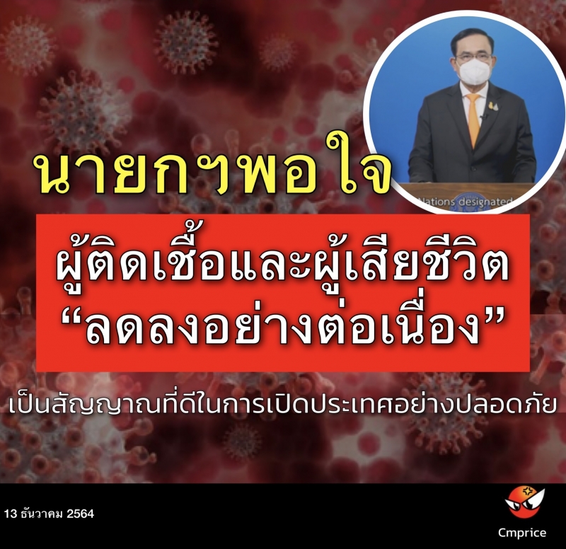 “นายกรัฐมนตรีพอใจ สำหรับสถานการณ์โควิดในประเทศไทย สัปดาห์ที่ผ่านมามีจำนวนผู้ติดเชื้อต่ำสุดและมีจำนวนผู้เสียชีวิตลดลง คาดว่าค่าเฉลี่ยของผู้ติดเชื้อและเสียชีวิตจะลดลงมาเรื่อยๆ ทั้งนี้จะต้องคอยเตือนให้ระวังตัว อย่าวางใจเกินไป ต้องระมัดระวังป้องกันตนเอง และปฏิบัติตามมาตรการ DMHTTA