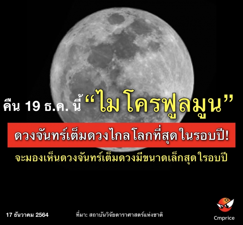 วันที่ 19 ธันวาคม 2564 เป็นคืนจันทร์เต็มดวงที่ดวงจันทร์จะโคจรอยู่ในระยะไกลโลกมากที่สุดในรอบปี หรือเรียกว่า“ไมโครฟูลมูน” ระยะห่างจากโลกประมาณ 405,924 กิโลเมตร คืนนั้นเราจะมองเห็นดวงจันทร์เต็มดวงมีขนาดปรากฏเล็กสุดในรอบปี เริ่มสังเกตดวงจันทร์ได้ด้วยตาเปล่าทางทิศตะวันออก หลังดวงอาทิตย์ลับขอบฟ้า เวลาประมาณ18:00 น. เป็นต้นไปจนถึงรุ่งเช้า