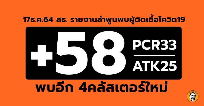 17 ธันวาคม 64 เพจศูนย์ข่าวโควิด 19 ลำพูน แถลงสถานการณ์โควิด-19 จ.ลำพูนพบผู้ติดเชื้อเพิ่ม 58ราย แบ่งเป็นการตรวจ RT-PCR 33ราย และเป็นการตรวจ ATK 25ราย สามารถดูและฟังแถลง ได้ข้างล่าง