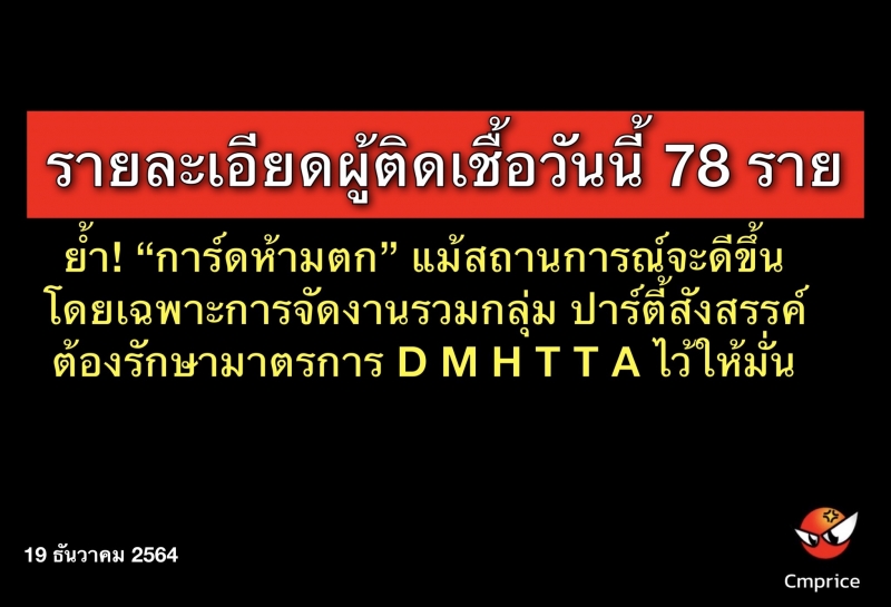 จังหวัดเชียงใหม่ เน้นย้ำประชาชน “การ์ดห้ามตก” แม้สถานการณ์โควิด-19 ในพื้นที่จะดีขึ้น โดยเฉพาะการจัดงานรวมกลุ่ม ปาร์ตี้สังสรรค์ ต้องรักษามาตรการ D M H T T A ไว้ให้มั่น