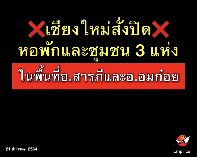 นายประจญ ปรัชญ์สกุล ผู้ว่าราชการจังหวัดเชียงใหม่ ในฐานะประธานคณะกรรมการโรคติดต่อจังหวัดเชียงใหม่ ผู้กำกับการบริหารราชการในสถานการณ์ฉุกเฉินจังหวัดเชียงใหม่ ลงนามคำสั่งคณะกรรมการโรคติดต่อจังหวัดเชียงใหม่ เรื่อง ปิดสถานที่เสี่ยงเป็นการชั่วคราว เพื่อให้การควบคุมและป้องกันโรค เป็นไปด้วยความเรียบร้อย และเกิดประสิทธิภาพสูงสุด จำนวน 3 สถานที่เสี่ยง ทั้งหอพักและชุมชน ในพื้นที่อำเภอสารภีและอำเภออมก๋อย  ได้แก่หอพักลุงขยัน เลขที่ 82 หมู่ที่ 3 ตำบลหนองผึ้ง อำเภอสารภี จังหวัดเชียงใหม่ ระหว่างวันที่ 18 - 31 ธันวาคม 2564, บ้านกองดา หมู่ที่ 14 ตำบลนาเกียน อำเภออมก๋อย จังหวัดเชียงใหม่ ระหว่างวันที่ 20 ธันวาคม 2564 - 2 มกราคม2565 และกลุ่มบ้านทุ่งต้นงิ้ว, กลุ่มบ้านปลอโกร,กลุ่มบ้านเด๊ะบือเซทะ, กลุ่มบ้านหม่าโอโจ และกลุ่มบ้านเคลอะกะชอเดหมู่ที่ 11 ตำบลแม่ตื่น อำเภออมก๋อย จังหวัดเชียงใหม่ ระหว่างวันที่ 20 ธันวาคม 2564 - 2 มกราคม 2565