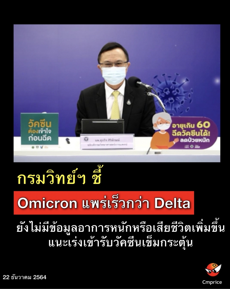 กรมวิทยาศาสตร์การแพทย์ ชี้ Omicron แพร่เร็วกว่า Delta ยังไม่มีข้อมูลอาการหนักหรือเสียชีวิตเพิ่มขึ้น แนะเร่งเข้ารับวัคซีนเข็มกระตุ้น