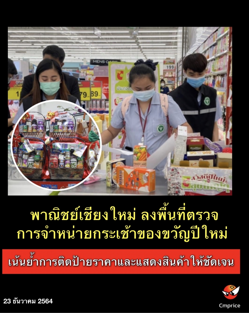 สำนักงานพาณิชย์จังหวัดเชียงใหม่ พร้อมด้วยหน่วยงานที่เกี่ยวข้อง ลงพื้นที่ออกตรวจการจำหน่ายกระเช้าของขวัญปีใหม่ เน้นย้ำการติดป้ายราคาและแสดงสินค้าให้ชัดเจน เพื่อป้องกันผู้บริโภคถูกเอาเปรียบ และมีโอกาสเปรียบเทียบราคาก่อนตัดสินใจซื้อ