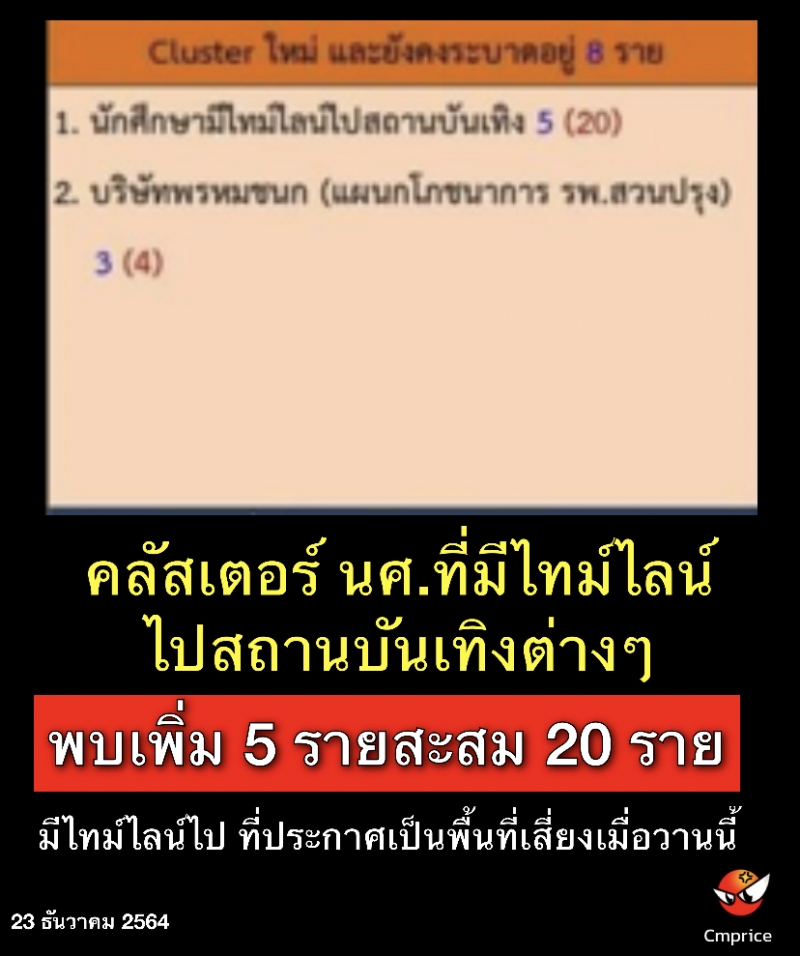 ทำให้ปัจจัยเสี่ยงการติดเชื้อจากการสัมผัสในสถานบันเทิงกลับเพิ่มขึ้นอีกครั้ง หลังจากไม่พบมาเป็นระยะเวลานานจากการพบคลัสเตอร์ในร้านอาหารและเครื่องดื่มที่เปิดให้มีการดื่มเครื่องดื่มแอลกอฮอล์ในร้าน จำนวนหลายราย จึงขอให้ทุกคนปฏิบัติตามมาตรการการป้องกันโรคส่วนบุคคลเคร่งครัด โดยเฉพาะในช่วงเทศกาลปีใหม่ที่จะถึงนี้ และภาพรวมของปัจจัยเสี่ยงในการติดเชื้อของจังหวัดเชียงใหม่ ยังคงเป็นการสัมผัสในครอบครัวเป็นปัจจัยหลัก รองลงมาเป็นการติดเชื้อจากการสัมผัสในชุมชนและการสัมผัสในที่ทำงาน