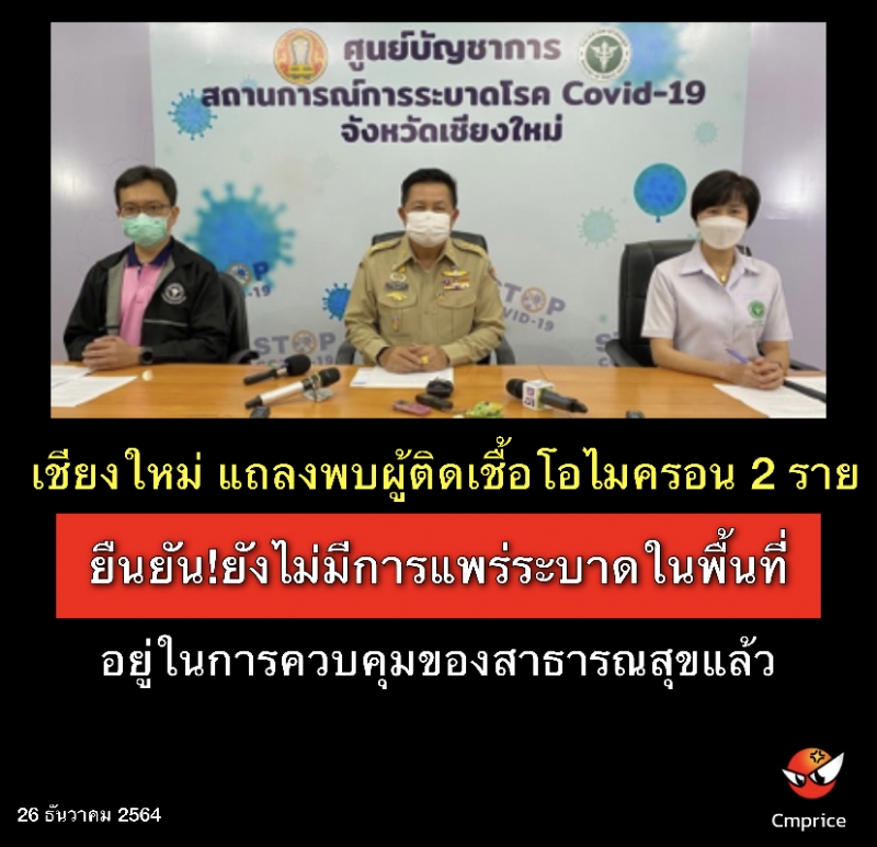 วันนี้ (26 ธ.ค. 64) ที่ศูนย์บัญชาการสถานการณ์การแพร่ระบาดโรค COVID-19 จังหวัดเชียงใหม่ นายประจญ ปรัชญ์สกุล ผู้ว่าราชการจังหวัดเชียงใหม่ พร้อมด้วย นายแพทย์วรัญญู จำนงประสาทพร รองนายแพทย์สาธารณสุขจังหวัดเชียงใหม่ และแพทย์หญิงเสาวนีย์ วิบุลสันติ ผู้อำนวยการสำนักงานป้องกันและควบคุมโรคที่ 1 เชียงใหม่ ร่วมกันแถลงการสอบสวนเบื้องต้นผู้ติดเชื้อไวรัสโคโรนา 2019 สายพันธุ์ที่มีความสำคัญทางสาธารณสุข จังหวัดเชียงใหม่