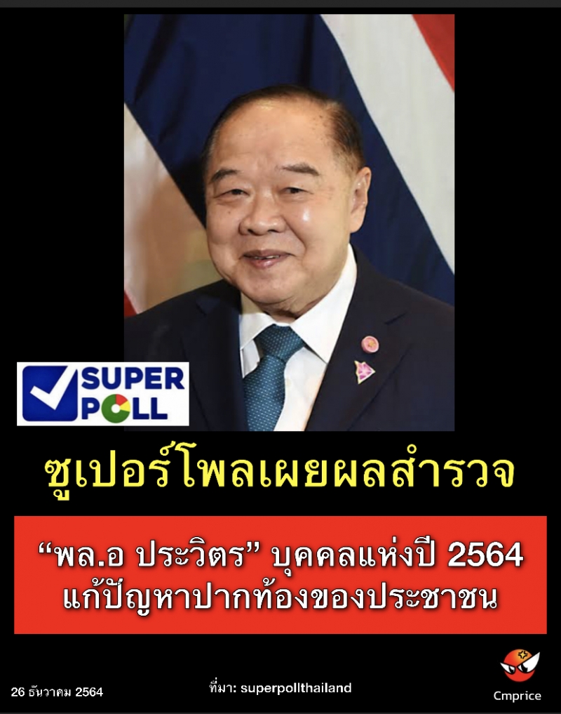 | • ซูเปอร์โพลเผยผลสำรวจ พล.อ ประวิตร บุคคลแห่งปี 2564 แก้ปัญหาปากท้องของประชาชน |
