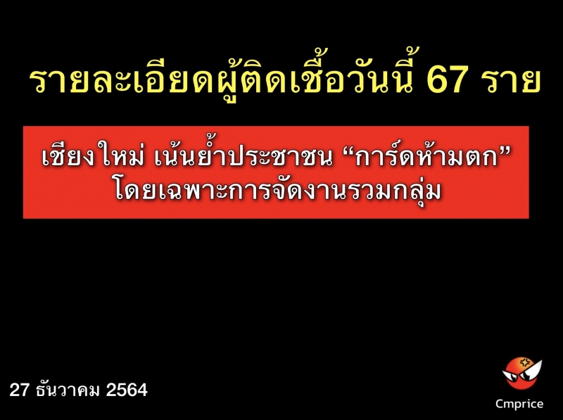 วันนี้ (27 ธ.ค. 64) ดร.ทรงยศ คำชัย หัวหน้ากลุ่มงานควบคุมโรคติดต่อ สำนักงานสาธารณสุขจังหวัดเชียงใหม่ เปิดเผยถึงสถานการณ์การแพร่ระบาดของโรคโควิด-19 จังหวัดเชียงใหม่ ประจำวันว่า มีผู้ติดเชื้อรายใหม่ 67 ราย โดยเป็นผู้ติดเชื้อที่เดินทางมาจากต่างพื้นที่ 2 ราย อีก 65 ราย เป็นผู้ติดเชื้อในจังหวัด โดยมาจากคลัสเตอร์ใหม่ และคลัสเตอร์ที่ยังมีการระบาดอย่างต่อเนื่อง 10 ราย ได้แก่ คลัสเตอร์ใหม่ วัดเจ็ดยอด ตำบลช้างเผือก 5 ราย เป็นกลุ่มสามเณรที่เดินทางไปต่างพื้นที่ แล้วกลับมาทำกิจวัตรประจำวันตามปกติ ทำให้แพร่กระจายไปสู่สามเณรและพระลูกวัดหลายราย, คลัสเตอร์ใหม่ บริษัทเดอะริช เมดิคอลโกลด์ จำกัด 2 ราย เป็นพนักงานของบริษัท, คลัสเตอร์ใหม่คนเก็บลำไย ตำบลหนองตอง อำเภอหางดง 1 ราย, คลัสเตอร์ร้านเลอเนิร์ฟ คาเฟ่ ตำบลช้างเผือก เขตเทศบาลนครเชียงใหม่1 ราย และคลัสเตอร์ใหม่ The Wisdom Clinic เซ็นทรัลแอร์พอร์ต ชั้น 3 จำนวน 1 ราย ขณะนี้ทีมควบคุมโรคในทุกพื้นที่ได้ลงทำการควบคุมโรค ตรวจคัดกรองเชิงรุกแยกกลุ่มเสี่ยงสูง กลุ่มเสี่ยงต่ำ ฆ่าเชื้อในพื้นที่ และสอบสวนโรคแล้ว