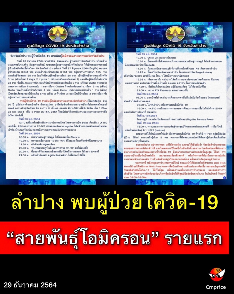 | • จ.ลำปาง ผู้ป่วยโควิด-19 "สายพันธุ์โอมิครอน" รายแรกของ จ.ลำปาง |