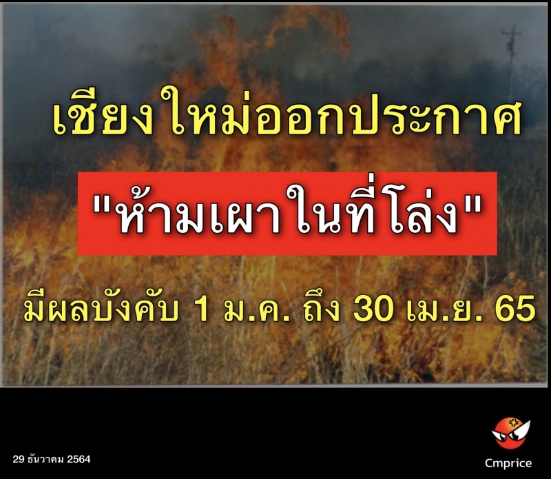 | • เชียงใหม่ออกประกาศ "ห้ามเผาในที่โล่ง" มีผลบังคับ 1 ม.ค. ถึง 30 เม.ย. 65 |