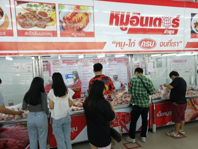 วันพฤหัสบดีที่ 30 ธันวาคม 2564 นางกนกรัตน์ ยุกติรัตน์ พาณิชย์จังหวัดลำพูน มอบหมายให้ นางสุกัลณี เสนานุช ผู้อำนวยการกลุ่มกำกับและพัฒนาเศรษฐกิจการค้า พร้อมด้วยเจ้าหน้าที่สำนักงานพาณิชย์จังหวัดลำพูน ติดตามการจำหน่ายเนื้อสุกร (หมูเนื้อแดง) กก.ละ 130 บาท ภายใต้โครงการ พาณิชย์ลดราคา!! ช่วยประชาชน ตามนโยบายของท่านจุรินทร์ ลักษณวิศิษฏ์ รองนายกรัฐมนตรีและรัฐมนตรีว่าการกระทรวงพาณิชย์ ที่ได้มอบนโยบายให้ กระทรวงพาณิชย์ โดยกรมการค้าภายใน ร่วมกับ บริษัท เอ็ม เอส พี อินเตอร์ฟู้ดส์ จำกัด (หมูอินเตอร์) จำหน่ายหมูเนื้อแดง กก.ละ 130 บาท ระหว่างวันที่ 30 - 31 ธันวาคม 2564 เพื่อช่วยเหลือลดภาระค่าครองชีพประชาชนเป็นการเร่งด่วน ในช่วงเทศกาลปีใหม่ 2565 โดยจังหวัดลำพูน มีร้านหมูอินเตอร์เข้าร่วมโครงการฯ จำนวน 4 สาขา ได้แก่ สาขาลำพูน สาขาป่าซาง สาขาบ้านโฮ่ง และสาขาลี้ ซึ่งแต่ละสาขาจัดจำหน่ายตั้งแต่ 13.00 น. เป็นต้นไป แห่งละ 100 กก./วัน จำกัดการซื้อ 1 กก./คน เท่านั้น โดยวันนี้พบว่า บรรยากาศคึกคักประชาชนให้ความสนใจซื้อหมูเนื้อแดง กก. 130 บาท กันอย่างต่อเนื่อง