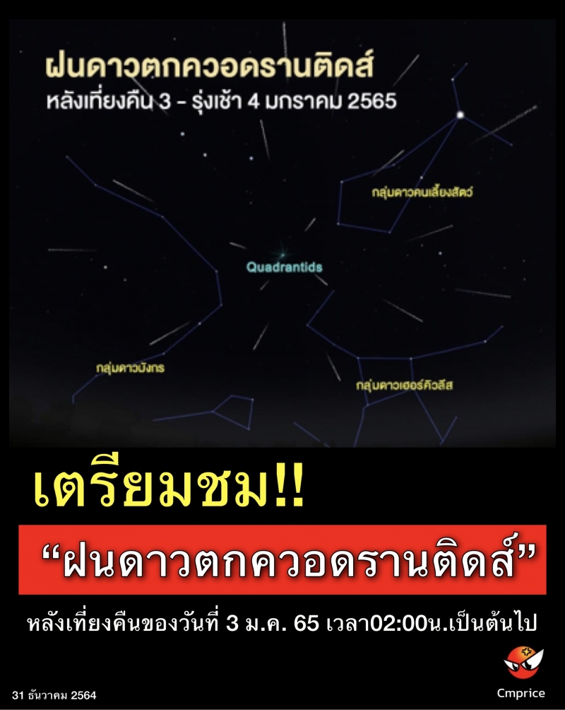 | • เตรียมชม ฝนดาวตกควอดรานติดส์รับปีใหม่ หลังเที่ยงคืนของวันที่ 3 มกราคม 2565 ตั้งแต่เวลา 02:00 น. เป็นต้นไป |
