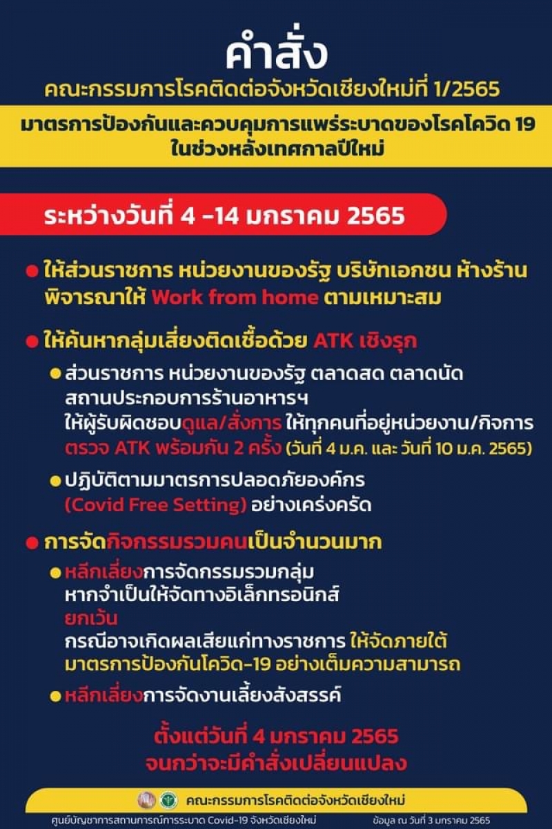 คณะกรรมการโรคติดต่อจังหวัดเชียงใหม่ ออกมาตรการป้องกันและควบคุมการแพร่ระบาดของโรคโควิด-19 หลังเทศกาลปีใหม่ สอดรับนโยบาย ศบค. โดยขอให้ทุกหน่วยพิจารณา Work from home และตรวจ ATK ทุกคน ก่อนกลับมาทำงาน