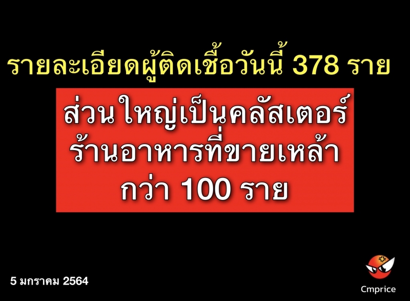 รายละเอียดผู้ติดเชื้อวันนี้ 378 รายส่วนใหญ่เป็นคลัสเตอร์ ร้านอาหารที่ขายเหล้า กว่า 100 ราย