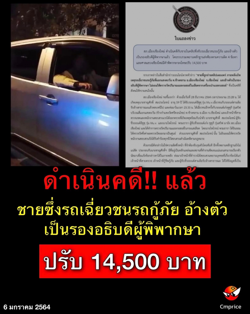 ดำเนินคดีแล้ว! ชายซึ่งรถเฉี่ยวชนรถกู้ภัย อ้างตัวเป็นรองอธิบดีผู้พิพากษา ศาลแขวงเชียงใหม่มีคำพิพากษาลงโทษปรับ 14,500 บาท
