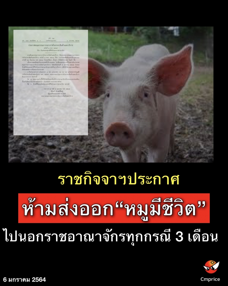 6 ม.ค. 65 เว็บไซต์ราชกิจจานุเบกษาเผยแพร่ ประกาศคณะกรรมการกลางว่าด้วยราคาสินค้าและบริการ ฉบับที่ 1 พ.ศ.2565 เรื่อง ห้ามส่งออกสุกรมีชีวิตไปนอกราชอาณาจักร