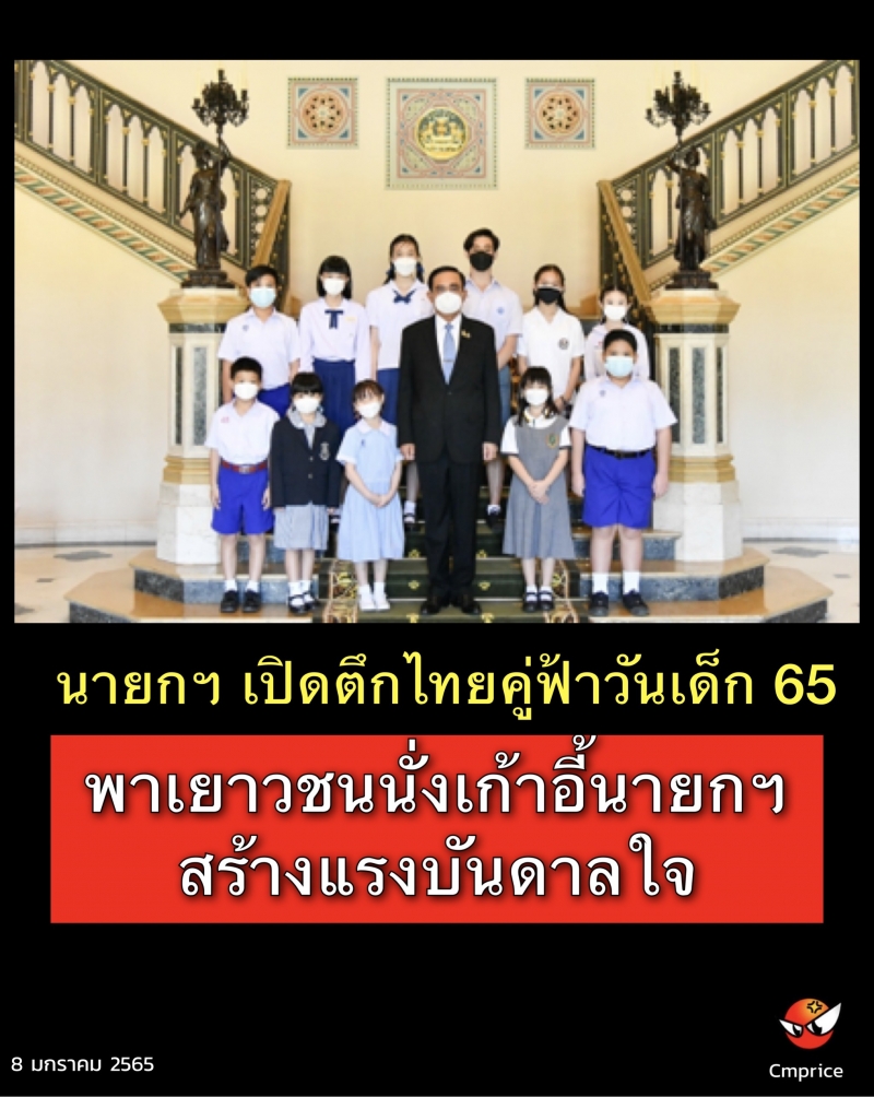 พล.อ. ประยุทธ์ จันทร์โอชา นายกฯ และ รมว.กลาโหม พาตัวแทนเด็กเยาวชน 5 คน นั่งเก้าอี้นายกรัฐมนตรี ณ ตึกไทยคู่ฟ้า ทำเนียบรัฐบาล ในรายการกิจกรรมงานฉลองวันเด็กแห่งชาติ ประจำปี 2565 ทำเนียบรัฐบาล ออกอากาศทางสถานีวิทยุโทรทัศน์แห่งประเทศไทย เพื่อสร้างขวัญกำลังใจ และสร้างแรงบันดาลใจแก่เด็กและเยาวชนในอนาคตพร้อมนั่งพูดคุยกับเด็กเยาวชนถึงความสนใจในด้านต่าง ๆ และความใฝ่ฝันถึงอาชีพที่อยากทำในอนาคต พร้อมอวยพรและขอให้ทุกคนมีความฝัน มีความตั้งใจในสิ่งที่อยากทำ ตั้งเป้าอนาคตของตนเอง ค้นหาสิ่งที่ตนเองชอบเพราะอาจมีหลากหลายด้าน ขอให้มีความกตัญญูรู้คุณต่อบิดา มารดา เพื่อที่ได้เป็นหนึ่งในพลังการขับเคลื่อนประเทศไทยไปข้างหน้าด้วยกัน
