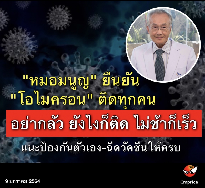 | • อย่ากลัว ยังไงก็ติด ไม่ช้าก็เร็ว"หมอมนูญ" ยืนยัน "โอไมครอน" ติดทุกคน แนะป้องกันตัวเองฉีดวัคซีนให้ครบ |