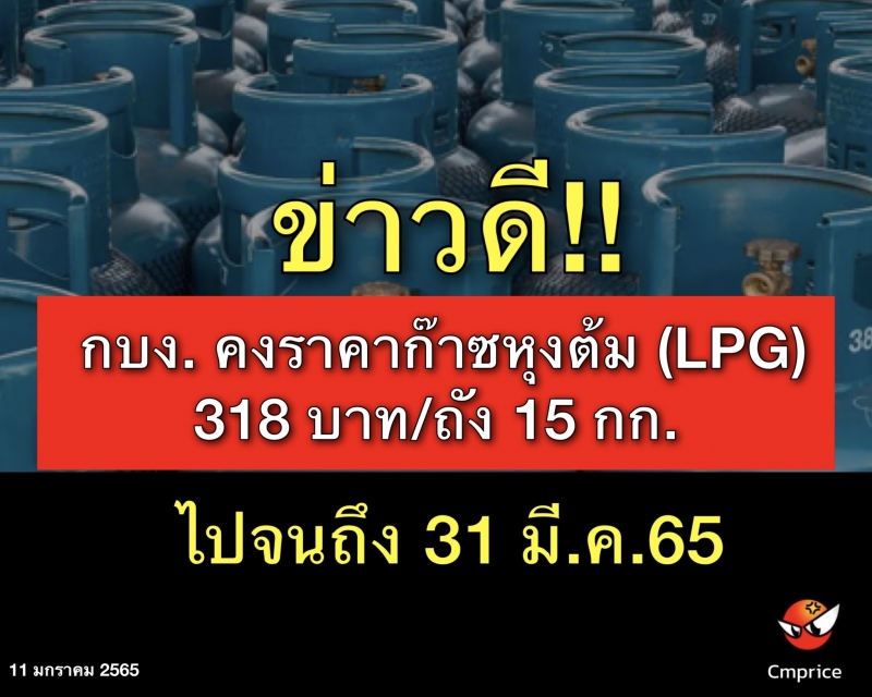 | • ข่าวดี!! กบง. คงราคาก๊าซหุงต้ม (LPG) 318 บาท/ถัง 15 กก. ไปจนถึง 31 มี.ค.65 |