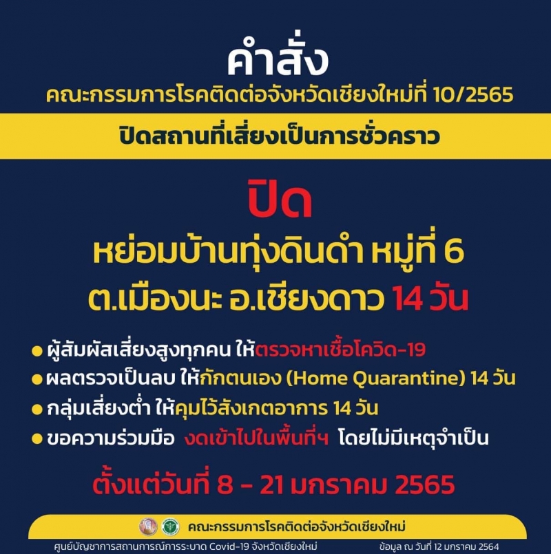 วันนี้ (12 ม.ค. 65) นายประจญ ปรัชญ์สกุล ผู้ว่าราชการจังหวัดเชียงใหม่ ในฐานะประธานคณะกรรมการโรคติดต่อจังหวัดเชียงใหม่ ผู้กำกับการบริหารราชการในสถานการณ์ฉุกเฉินจังหวัดเชียงใหม่ ลงนามคำสั่งคณะกรรมการโรคติดต่อจังหวัดเชียงใหม่ ที่ 10/2565 เรื่อง ปิดสถานที่เสี่ยงเป็นการชั่วคราว โดยสั่งปิดพื้นที่หมู่บ้านน้ำรู (หย่อมบ้านทุ่งดินดำ) หมู่ที่ 6 ตำบลเมืองนะ อำเภอเชียงดาว จังหวัดเชียงใหม่ เป็นเวลา 14 วัน ระหว่างวันที่ 8 - 21 มกราคม 2565 ภายหลังพบการติดเชื้อโรคโควิด-19 เป็นกลุ่มก้อน
