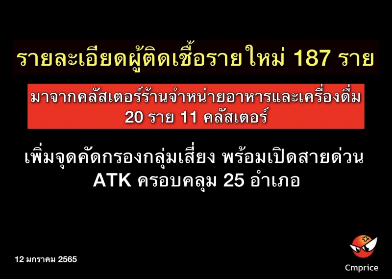 รายละเอียดผู้ติดเชื้อรายใหม่ 187 ราย มาจากคลัสเตอร์ร้านจำหน่ายอาหารและเครื่องดื่ม 20 ราย 11 คลัสเตอร์