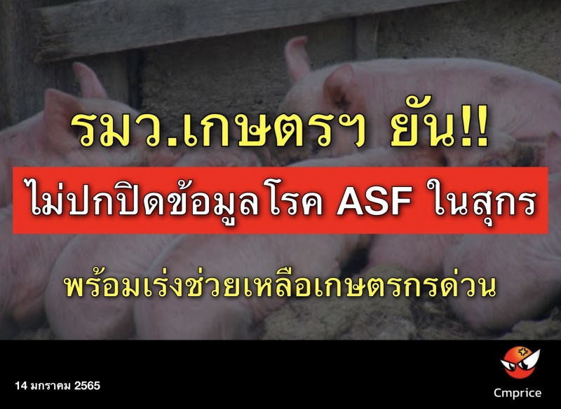 กรมปศุสัตว์ไม่เคยปกปิดโรค ASF ในสุกร ดำเนินการเฝ้าระวังป้องกันโรคมาตั้งแต่ปี 61 ที่พบการระบาดโรคครั้งแรกในประเทศจีน ได้ติดตามสถานการณ์และเตรียมพร้อมรับมือต่อโรคมาโดยตลอด หนึ่งในมาตรการที่ดำเนินการคือการลดความเสี่ยงโดยการทำลายสุกรที่มีความเสี่ยงสูงเพื่อป้องกันการเกิดโรค พร้อมชดใช้ราคาสุกรที่ถูกทำลาย