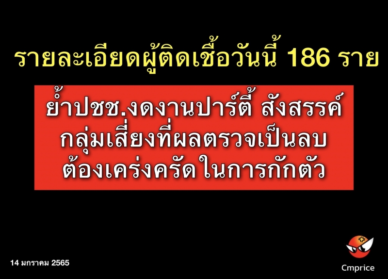 สถานการณ์การแพร่ระบาดของโรคโควิด-19 จังหวัดเชียงใหม่ วันนี้ (14 ม.ค. 65) มีผู้ติดเชื้อรายใหม่ 186 ราย โดยเป็นผู้ติดเชื้อที่เดินทางมาจากต่างพื้นที่ 9 ราย ได้แก่ ผู้ที่เดินทางมาจากต่างประเทศ ตามโปรแกรม Test & Go 3 ราย, กรุงเทพมหานคร ลำปาง เชียงราย ตาก เพชรบูรณ์ และนนทบุรี จังหวัดละ 1 รายส่วนอีก 177 ราย เป็นผู้ติดเชื้อในจังหวัด โดยมาจากคลัสเตอร์ใหม่และคลัสเตอร์ที่ยังคงมีการระบาดอยู่ 9 ราย จาก 4 คลัสเตอร์ ประกอบด้วย โกดังแยกสินค้า Kerry ตำบลไชยสถาน อำเภอสารภี 5 ราย, สำนักงานส่งเสริมเศรษฐกิจสร้างสรรค์ 2 ราย, สำนักงานตำรวจภูธรภาค 5 หนองหอย 1 ราย และร้าน Woodstock Café and Bar 1 ราย ขณะนี้คณะกรรมการโรคติดต่อจังหวัดเชียงใหม่ได้มีคำสั่งปิดสถานที่เสี่ยงเหล่านี้แล้ว โดยทีมควบคุมโรคได้ทำการควบคุมโรค ฆ่าเชื้อ ตรวจคัดกรองเชิงรุกค้นหากลุ่มเสี่ยงสูง กลุ่มเสี่ยงต่ำ และออกคำสั่งกักตัวผู้สัมผัสที่มีผลตรวจเป็นลบเป็นเวลา 14 วันแล้ว