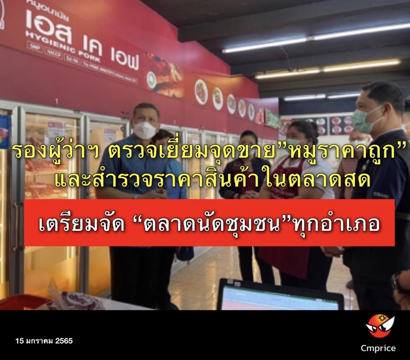 รองผู้ว่าราชการจังหวัดเชียงใหม่ ตรวจเยี่ยมจุดจำหน่ายเนื้อหมูราคาถูก ตามโครงการหมูพาณิชย์ลดราคาช่วยประชาชน พร้อมสำรวจราคาสินค้าในตลาดสด เผยจังหวัดเชียงใหม่ เตรียมจัด “ตลาดนัดชุมชน” ในทุกอำเภอ และจัดโปรโมชั่นพิเศษไข่ไก่ลดราคา เพื่อบรรเทาภาระค่าครองชีพของประชาชน