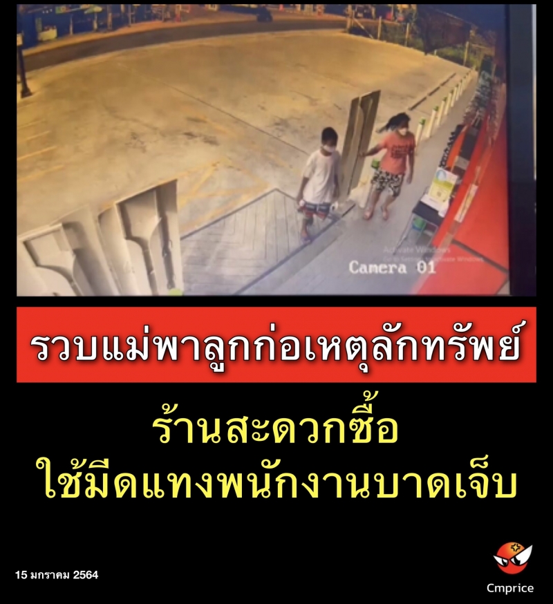| • รวบแม่พาลูกก่อเหตุลักทรัพย์ร้านสะดวกซื้อใช้มีดแทงพนักงานบาดเจ็บ |