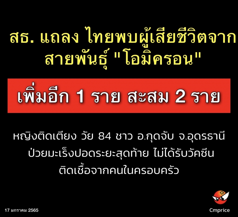 | • สธ. แถลง ไทยพบผู้ป่วยโควิด 19 เสียชีวิตจากสายพันธุ์ "โอมิครอน" เพิ่มอีก 1 ราย สะสม 2 ราย |
