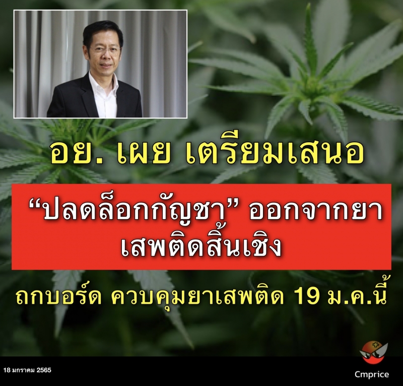 | • อย. เผย เตรียมเสนอ ปลดล็อกกัญชา ออกจากยาเสพติดสิ้นเชิง ถกบอร์ด ควบคุมยาเสพติด 19 ม.ค.นี้ |
