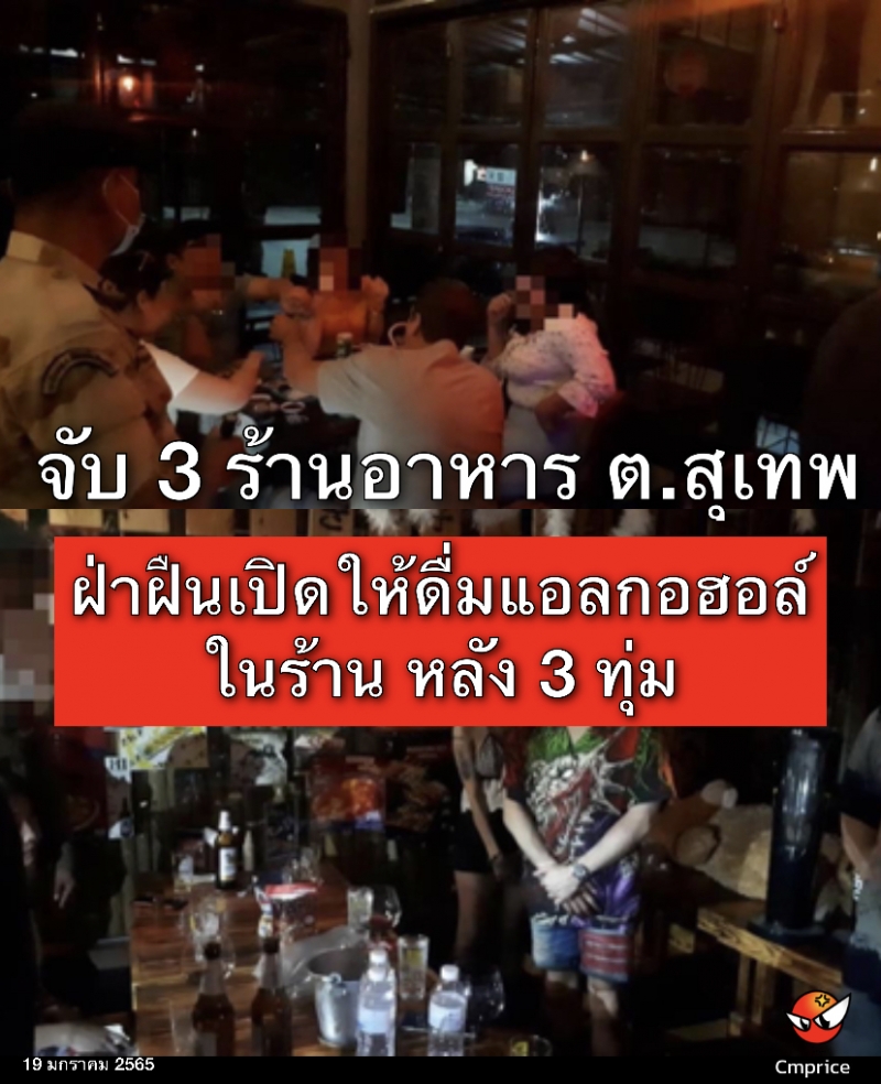 จับ 3 ร้านอาหาร สถานประกอบการ พื้นที่ตำบลสุเทพ ฝ่าฝืนเปิดให้ดื่มแอลกอฮอล์ในร้าน หลัง 3 ทุ่ม