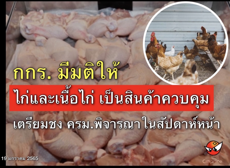 นายจุรินทร์ ลักษณวิศิษฏ์ รองนายกฯ และ รมว.พาณิชย์ เปิดเผยภายหลังการประชุมกรรมการกลางว่าด้วยราคาสินค้าและบริการ (กกร.) ครั้งที่ 2/2565 ผ่านระบบทางไกล ว่า ที่ประชุมมีมติให้ไก่และเนื้อไก่เป็นสินค้าควบคุม และให้ความเห็นชอบกำหนดมาตรการ ให้ผู้เลี้ยงไก่ที่มีปริมาณการเลี้ยงตั้งแต่ 100,000 ตัวขึ้นไป และโรงชำแหละไก่ที่มีกำลังการผลิตมากกว่า 4,000 ตัวต่อวัน แจ้งปริมาณ สต๊อก และต้นทุนราคาจำหน่ายทุกเดือน กำหนดให้โรงงานผลิตอาหารสัตว์ซึ่งมีอยู่ทั้งหมด 55 โรง แจ้งต้นทุนราคาจำหน่าย ปริมาณการผลิตและสต๊อก กำหนดมาตรการให้การปรับราคาต้องได้รับอนุญาตจากกรมการค้าภายในก่อน โดยกระทรวงพาณิชย์จะนำเสนอผลการประชุมดังกล่าวต่อที่ประชุมคณะรัฐมนตรีเห็นชอบในสัปดาห์หน้าต่อไป