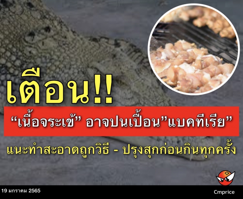 | • เตือน!! เนื้อจระเข้ อาจปนเปื้อนแบคทีเรีย แนะทำสะอาดถูกวิธี - ปรุงสุกก่อนกินทุกครั้ง |