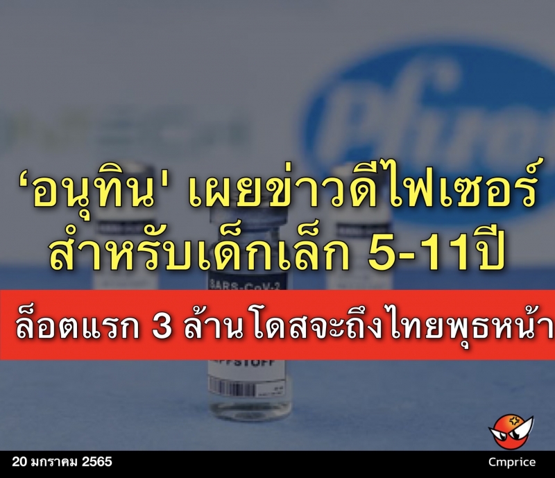 ‘อนุทิน' เผยข่าวดีไฟเซอร์สำหรับเด็กเล็ก ล็อตแรก 3 ล้านโดสจะถึงไทยพุธหน้า จะเร่งตรวจคุณภาพแล้วกระจายฉีดนำร่องฉีดในเด็ก 5 - 11 ปี กลุ่มเป้าหมายที่ป่วยมีโรคประจำตัวก่อน