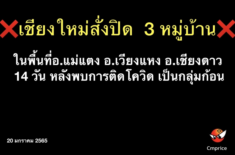 คณะกรรมการโรคติดต่อจังหวัดเชียงใหม่ สั่งปิด 3 หมู่บ้านในพื้นที่อำเภอแม่แตง อำเภอเวียงแหง อำเภอเชียงดาว14 วัน หลังพบการติดเชื้อโรคโควิด-19 เป็นกลุ่มก้อน