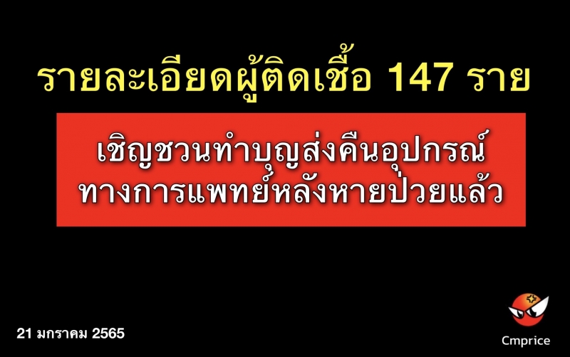 จังหวัดเชียงใหม่ พบผู้ติดเชื้อรายใหม่ 147 ราย วันนี้พบผู้เสียชีวิตเพิ่มอีก 1 ราย พร้อมเชิญชวนทำบุญส่งคืนอุปกรณ์ทางการแพทย์ให้กับโรงพยาบาลหลังหายป่วยแล้ว ภายใต้แคมเปญ “เพราะการให้ คือ ความสุข”