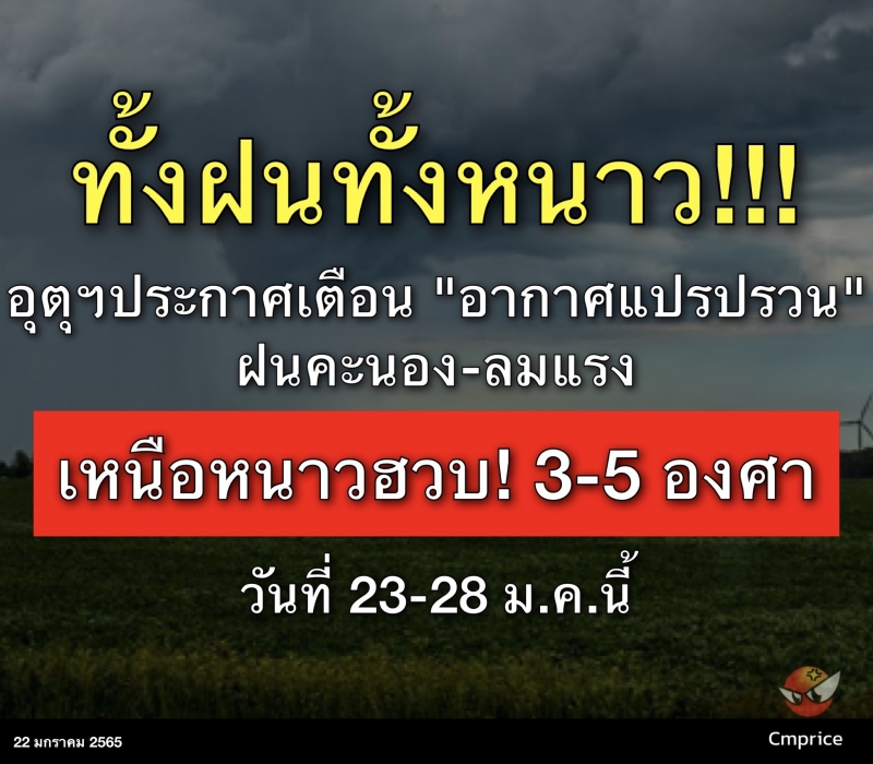 | • อุตุฯประกาศเตือน "อากาศแปรปรวน" ฝนคะนองลมแรง เหนือหนาวฮวบ! 3-5 องศา วันที่ 23-28 ม.ค.นี้ |