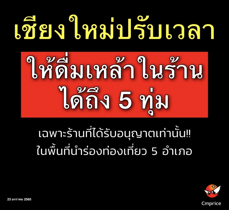 | • เชียงใหม่ปรับเวลาให้ดื่มเหล้าในร้านได้ถึง 5 ทุ่ม เฉพาะร้านที่ได้รับอนุญาตอเท่านั้น!! พื้นที่นำร่องท่องเที่ยว 5 อำเภอ |