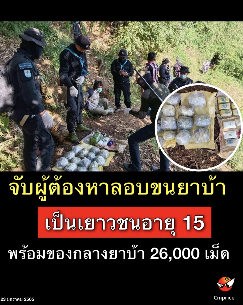 เมื่อ ๒๓ ม.ค.๖๕ เวลา ๑๐๓๐ ร้อย.ทพ.๓๒๐๑ บก.ควบคุม ทพ.ศปก.ทภ.๓ ได้รับแจ้งจากเเหล่งข่าวว่า จะมีกลุ่มขบวนการค้ายาเสพติด ลักลอบลำเลียงยาเสพติดเข้ามาในพื้นที่ จึงได้จัด กพ. ๒ ชป.ลว.เฝ้าตรวจ ช่องทาง บ.ป่ากุ๊ยและช่องทางหมากลางน้อย ต.ท่าตอน อ.แม่อาย จว.ช.ม. ขณะ ลว.เฝ้าตรวจ ชป.หมากลางน้อยฯ ตรวจการณ์พบบุคคลต้องสงสัย จำนวน ๒ คน พร้อมสัมภาระแบกหลัง เดินอยู่บริเวณช่องทางหลัง บ.ป่ากุ๋ยฯ จึงได้วิทยุแจ้ง ชป.๑ เข้าสกัดกั้นและแสดงตัวเป็นเจ้าหน้าที่ขอทำการตรวจค้นกลุ่มบุคคลดังกล่าว เมื่อกลุ่มบุคคลเห็นเจ้าหน้าที่ได้วิ่งหลบหนี จึงไล่ติดตามสามารถจับกุมตัวไว้ได้ ๑ คน พร้อมสัมภาระ ชายอีกคนวิ่งหลบหนีไปฝั่ง สมม. ไม่สามรรถตามตัวได้จากการตรวจค้นขั้นต้น ดังนี้