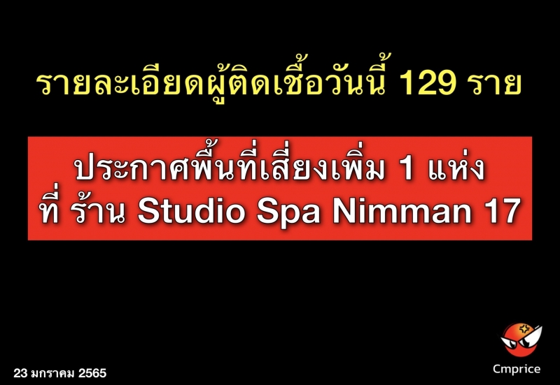 | • แจ้งผู้ที่เดินทางไปร้าน Studio Spa Nimman 17 วันที่ 16-21 ม.ค. ให้เข้ารับการตรวจหาเชื้อโควิด-19 และกักตัว 10 วัน |