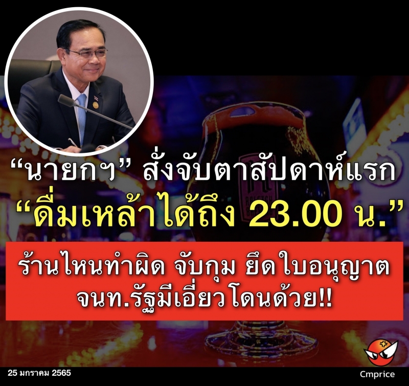 | • นายกฯ สั่งจับตาสัปดาห์แรก ดื่มเหล้าได้ถึง23.00น. ร้านไหนทำผิด จับกุม ยึดใบอนุญาต จนท.รัฐมีเอี่ยวโดนด้วย |