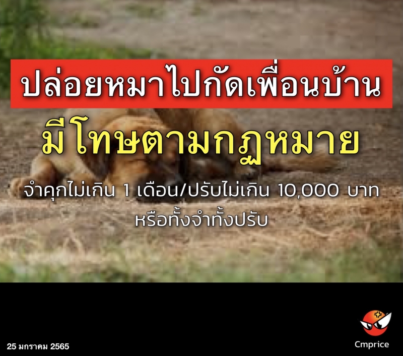 | • ปล่อยหมาไปกัดเพื่อนบ้าน มีโทษตามกฏหมาย จำคุกไม่เกิน 1 เดือน หรือปรับไม่เกิน 10,000 บาท หรือทั้งจำทั้งปรับ |