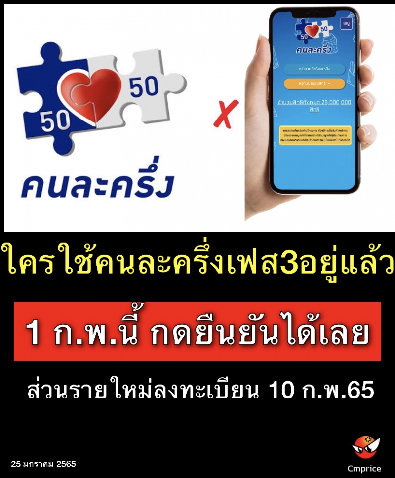 | • ใครใช้คนละครึ่งเฟส3อยู่แล้ว 1 ก.พ.นี้ กดยืนยันได้เลย ส่วนรายใหม่ลงทะเบียน 10 ก.พ.65 |