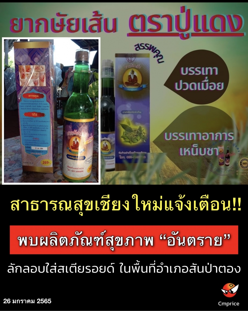 นายวรัญญู จำนงประสาทพร นายแพทย์ชำนาญการพิเศษ รักษาราชการแทน สาธารณสุขจังหวัดเชียงใหม่ เปิดเผยว่าพบผลิตภัณฑ์สุขภาพ “อันตราย” ลักลอบใส่สเตียรอยด์ ได้แก่ ยารวมสมุนไพร (สูตรโบราณ), สมุนไพรแผนโบราณ, สมุนไพรไทยคุณธงชัย, สมุนไพรแผนโบราณ, สมันไพรประดง 108 และยากษัยเส้น เป็นต้น โดยในพื้นที่อำเภอสันป่าตอง จังหวัดเชียงใหม่ พบผลิตภัณฑ์ “ยากษัยเส้น ตราปู่แดง” สรรพคุณ ลดอาการปวด กระดูกทับเส้น ซึ่งมีผู้บริโภคในพื้นที่นำมาบริโภคเป็นจำนวนมาก เมื่อตรวจด้วยชุดทดสอบสเตียรอยด์เบื้องต้น พบสเตียรอยด์ ซึ่งผลิตภัณฑ์เหล่านี้มักลักลอบใส่สาร สเตียรอยด์ อันตรายต่อสุขภาพ และผิดกฎหมาย ผู้จำหน่ายมีโทษปรับและจำคุก ผู้บริโภคอาจแพ้รุนแรง หากใช้ยาเกินขนาด หรือใช้เป็นเวลานานเสี่ยง “เสียสุขภาพ และชีวิต” จึงได้แจ้งข้อมูลดังกล่าวไปยังเจ้าหน้าที่กลุ่มงานคุ้มครองผู้บริโภคและเภสัชสาธารณสุข สำนักงานสาธร ณ สุขจังหวัดเชียงใหม่ดำเนินการต่อไป