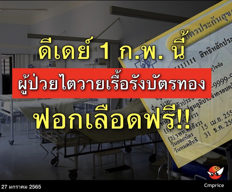 ดีเดย์ 1 ก.พ. ผู้ป่วยไตวายเรื้อรังบัตรทองฟอกเลือดฟรี!!